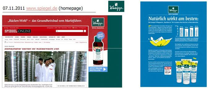 2011年秋季德国克奈圃公司在媒体上做了克奈圃品牌宣传,此举又再次加深了克奈圃品牌在德国的影响力。其中值得一提的是9-10月我司在德国RTL频道晚上7:13天气预报前进行Kneipp电视广告播放。效果良好,70%以上的观众对此广告给予以好评。